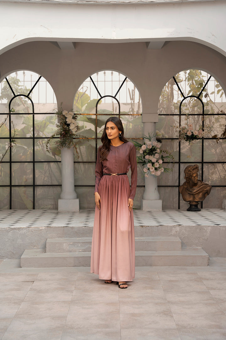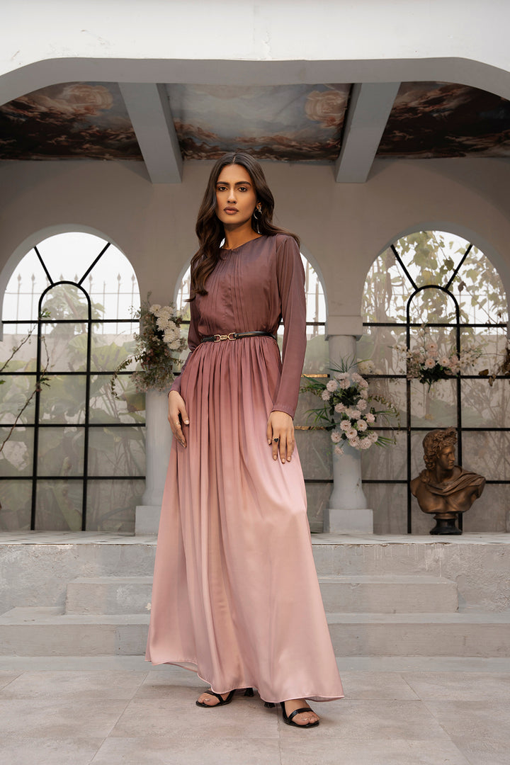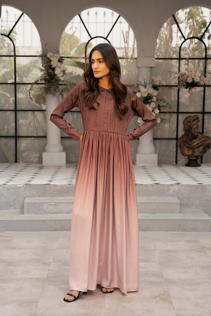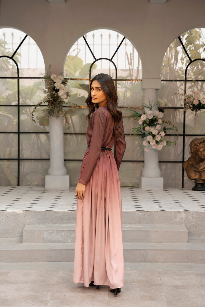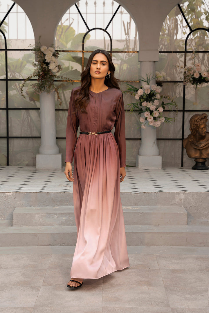 • A breathtaking gradient maxi dress featuring a seamless transition from rich dark brown to pristine white