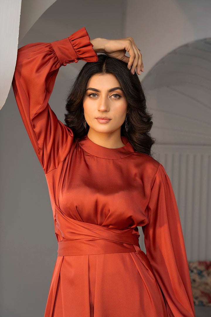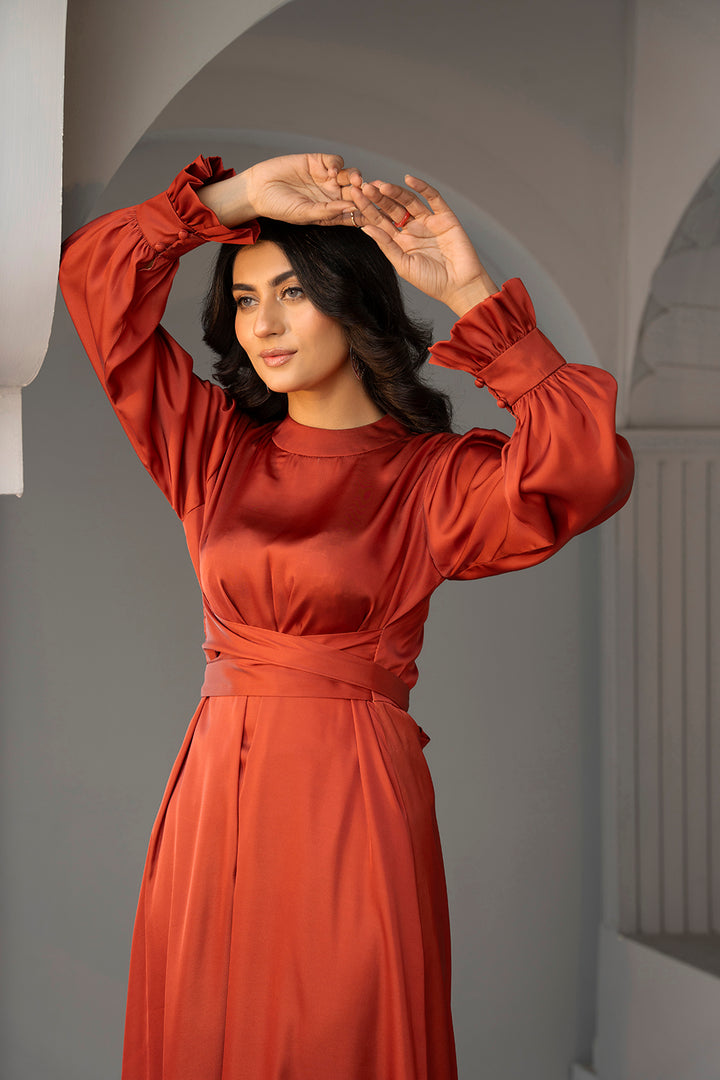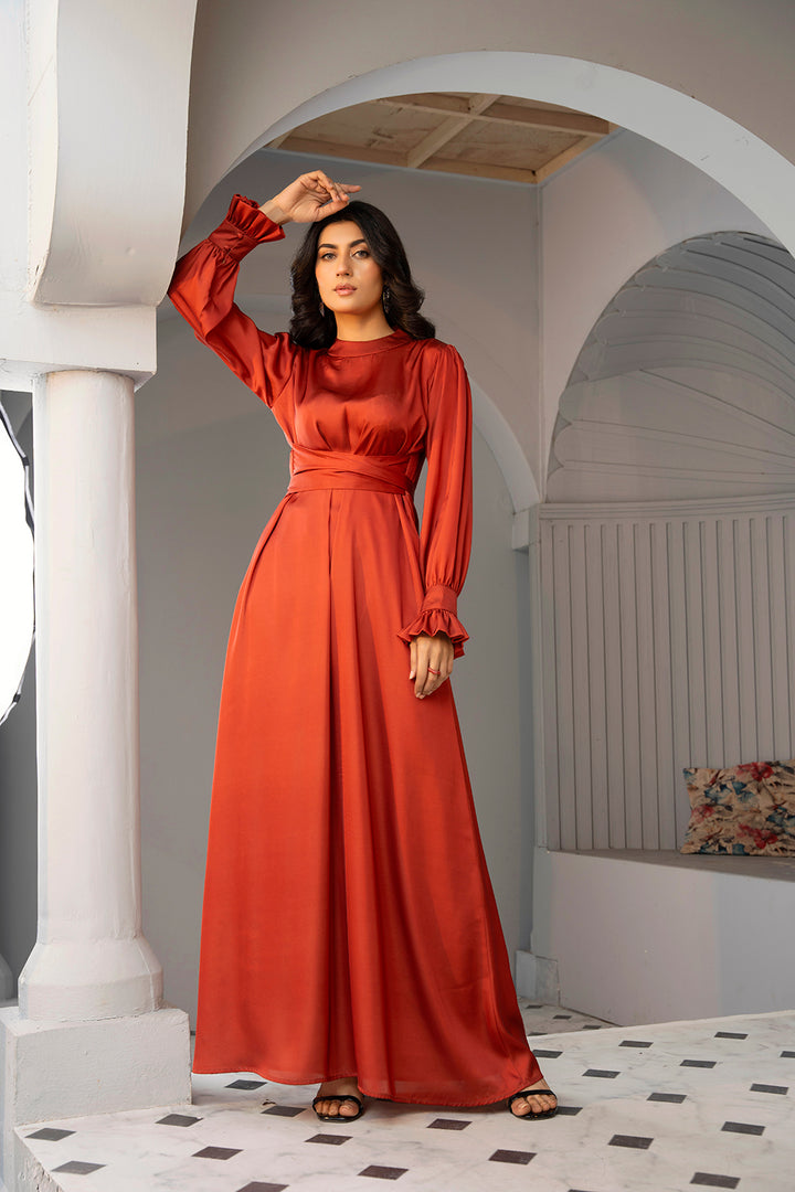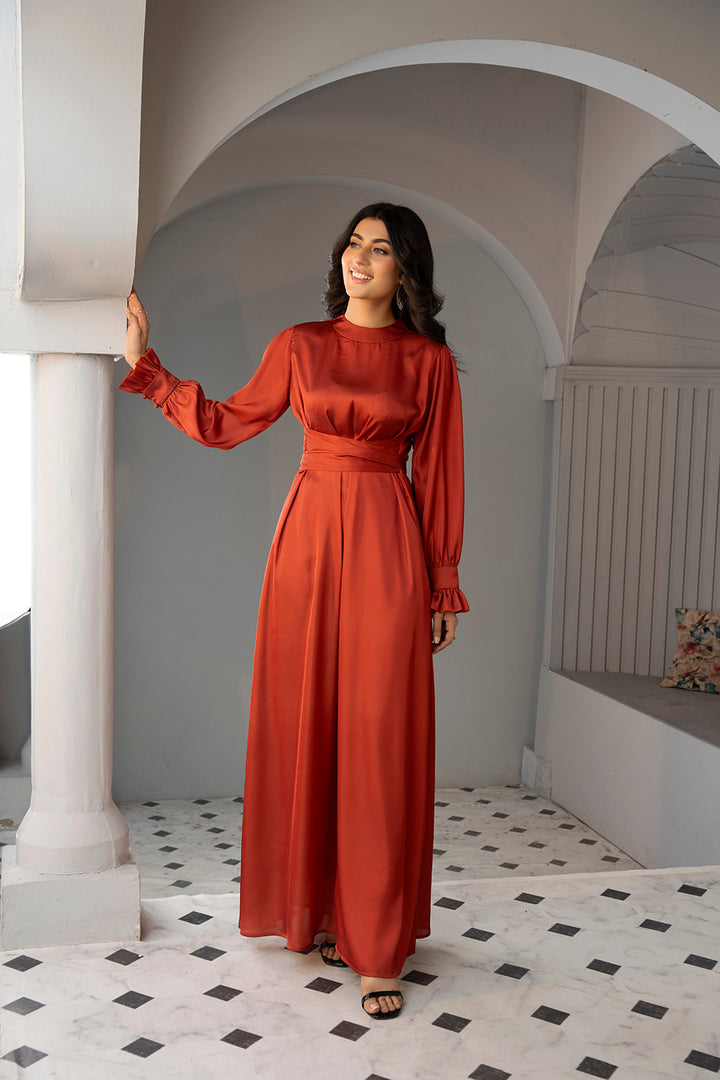 • A rust silk maxi dress designed to radiate confidence and elegance with a flattering silhouette